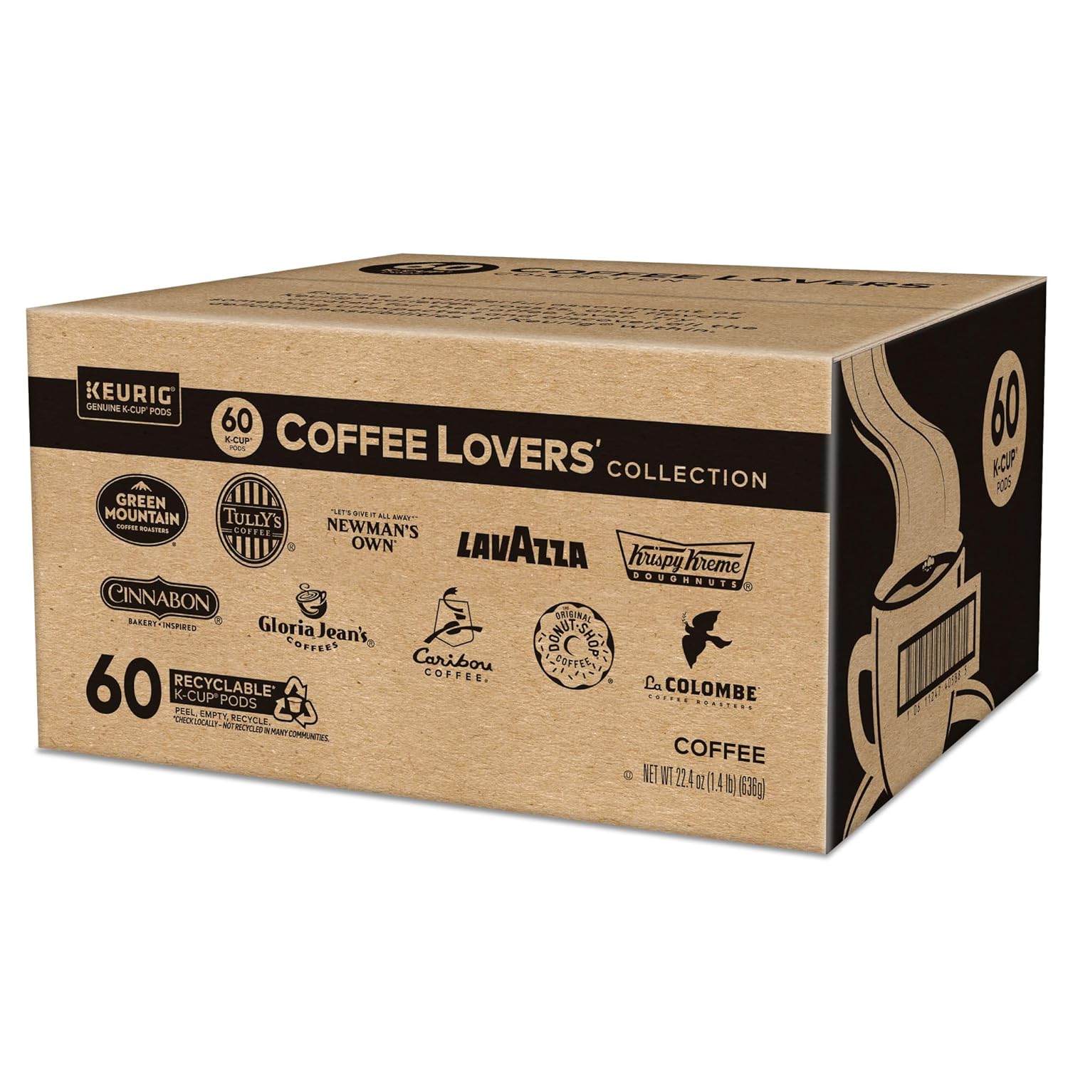 Explore a wonderful assortment of coffee and discover your favorites with the Keurig Coffee Lovers’ Collection. Loaded with delicious possibilities and curated for you, the coffee lover, this variety pack includes 60 K-Cup pods spanning 20 different varieties from 10 of your favorite brands. The Keurig Coffee Lovers’ Collection includes three K-Cup pods each of: Caribou Coffee Caribou Blend (medium roast) Caribou Coffee Daybreak Blend (light roast) Cinnabon Classic Cinnamon Roll (flavored light roast) Gloria Jean’s Coffees Butter Toffee (flavored medium roast) Gloria Jean’s Coffees Hazelnut (flavored medium roast) Green Mountain Coffee Roasters Breakfast Blend (light roast) Green Mountain Coffee Roasters Colombia Select (medium roast) Green Mountain Coffee Roasters Dark Magic (dark roast) Green Mountain Coffee Roasters Nantucket Blend (medium roast) Krispy Kreme Doughnuts Coffee Classic (medium roast) La Colombe Coffee Roasters Corsica (darker roast) La Colombe Coffee Roasters Nizza (medium roast) Lavazza Classico (medium roast) Newman’s Own Organic French Roast (dark roast) Newman’s Own Organic Special Blend (medium roast) The Original Donut Shop Coffee Dark (dark roast) The Original Donut Shop Coffee Duos Nutty + Caramel (flavored medium roast) The Original Donut Shop Coffee Regular (medium roast) Tully’s Coffee Hawaiian Blend (medium roast) Tully’s Coffee Italian Roast (dark roast) Each K-Cup pod is filled with freshly ground coffee beans and is compatible with all Keurig single serve coffee makers. Simple. Delicious. And recyclable.* Enjoy the same great-tasting coffee you know and love, and when you’re done, just peel, empty, and recycle.*Check locally, not recycled in many communities.